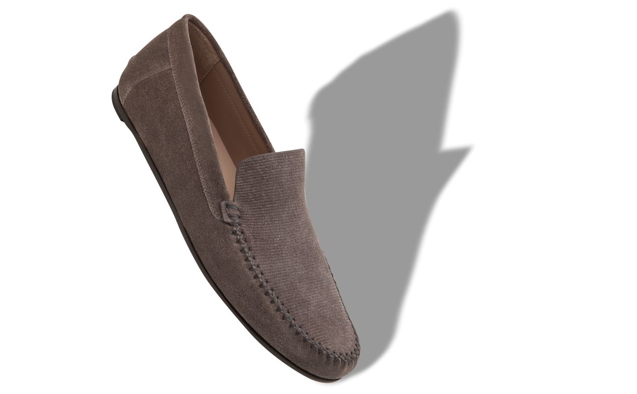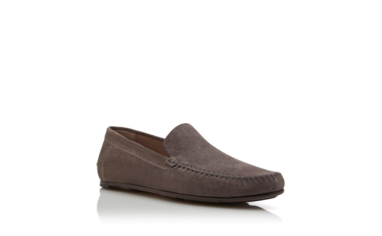 Grey suede slippers featuring slip-on design and stitching details. Finished with flat rubber sole.Upper: 100% calf suede. Sole: 80% rubber, 20% calf leather. Lining: 100% calf leather.Heel measures 10 mm.UK sizing.Made in Italy.