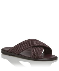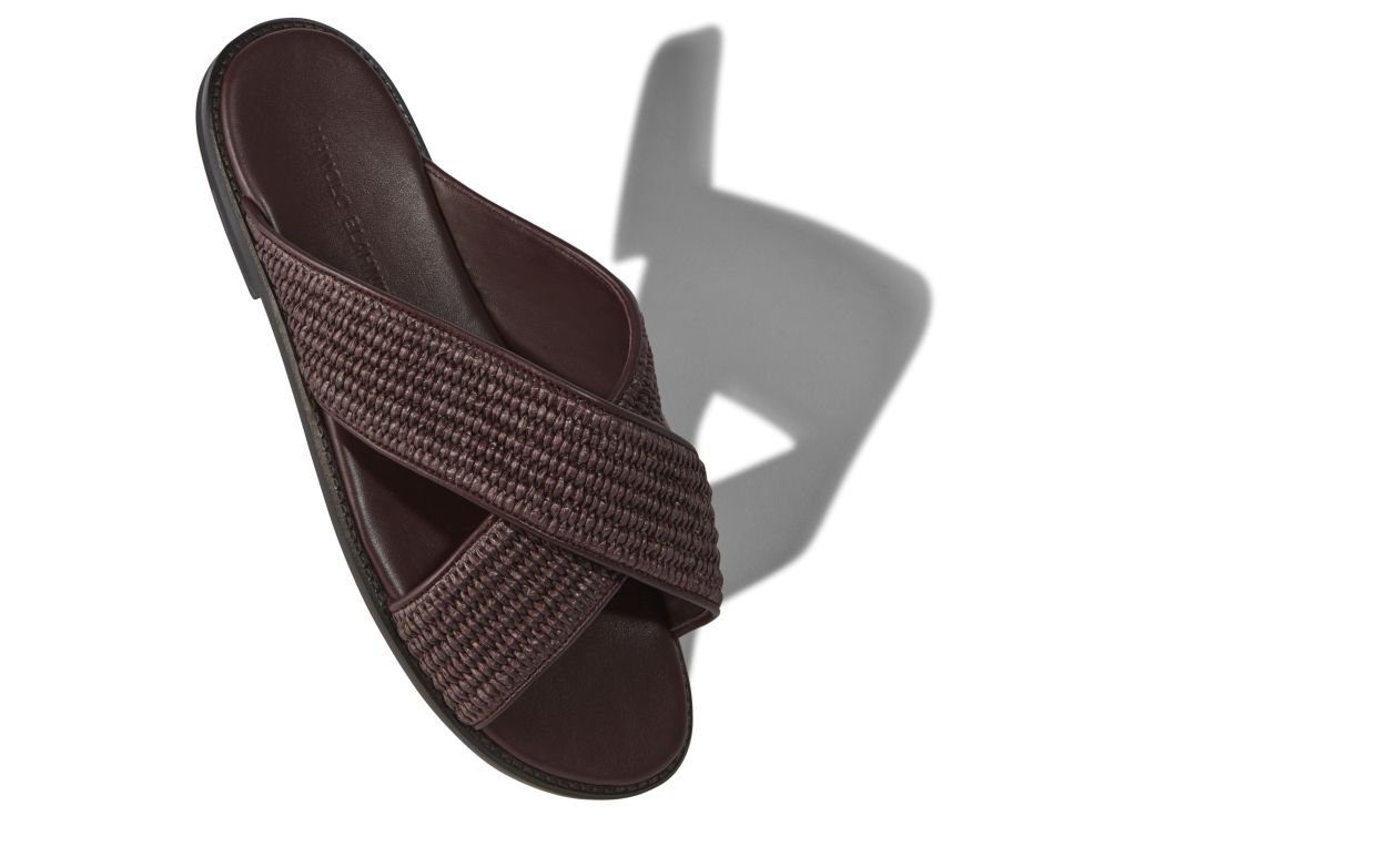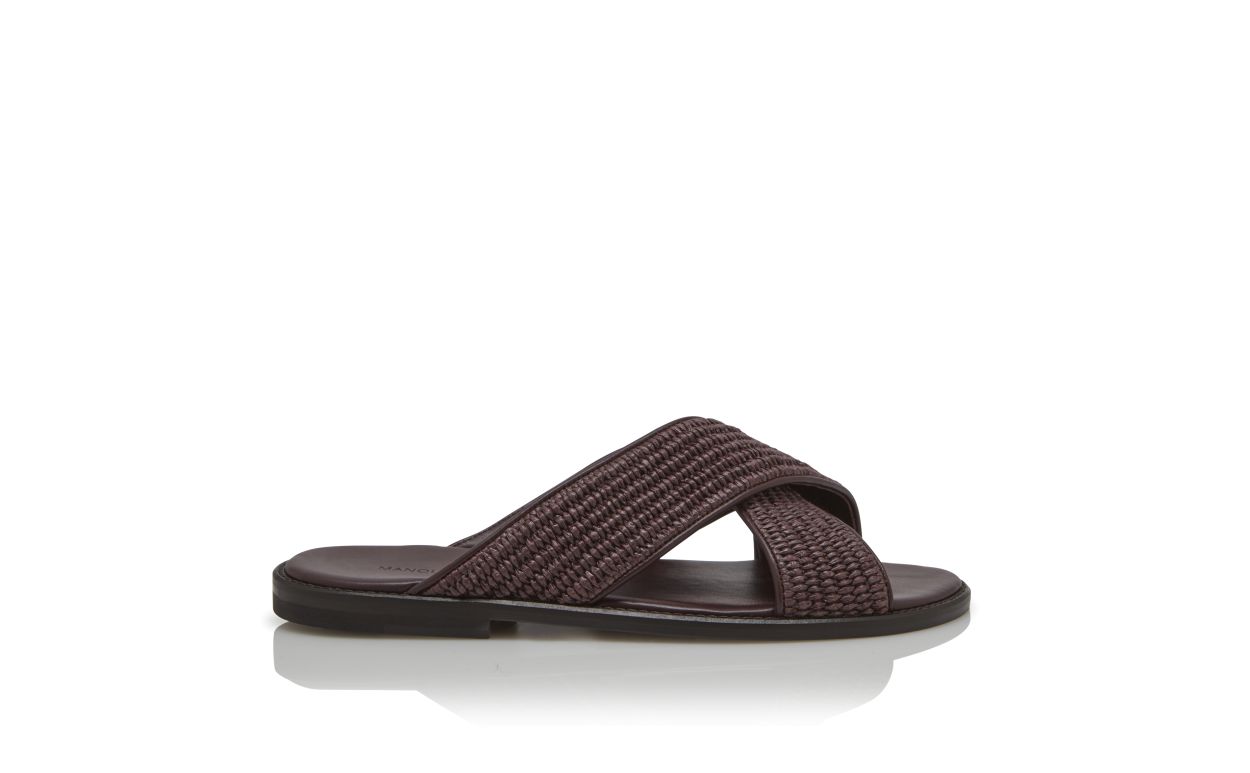 Mahogany brown raffia sandals featuring open toe design with overlapping front straps and calf leather trim.Upper: 80% natural fibre, 20% calf leather. Sole: 100% calf leather. Lining: 100% cow leather. Heel measures 10 mm. Made in Italy.