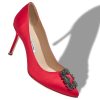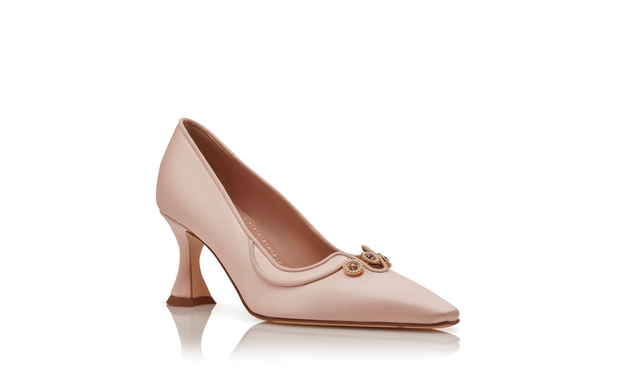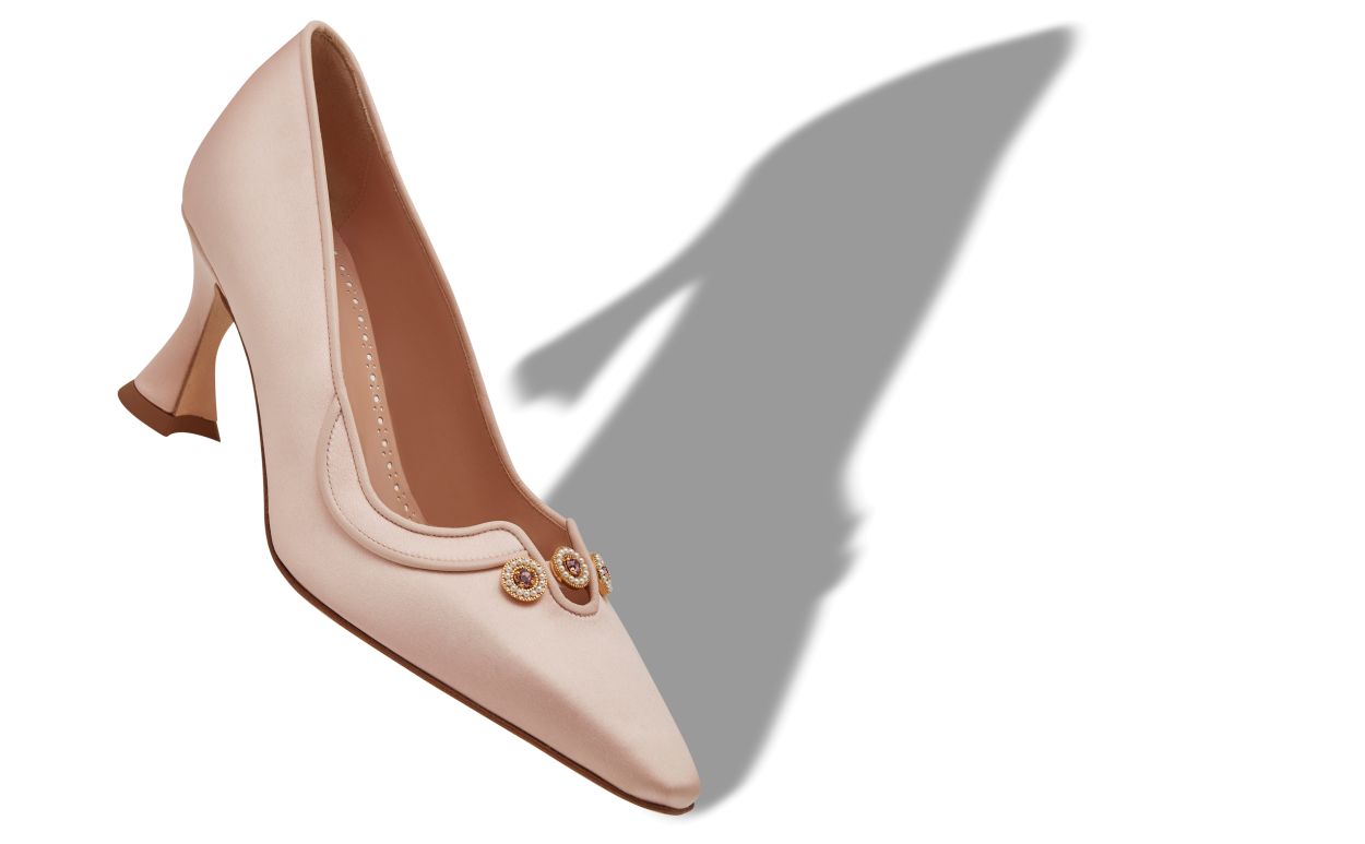 Light pink satin pointed toe pumps featuring jewel embellished design details and flared mid heel.Upper: 72% viscose, 28% silk. Sole: 100% calf leather. Lining: 100% kid leather. Heel measures 70 mm. Italian sizing. Made in Italy.