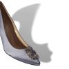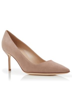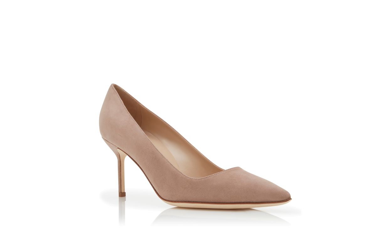 Light beige suede pointed toe pumps featuring stiletto mid heel. Upper: 100% kid suede. Sole: 100% calf leather. Lining: 100% kid leather. Heel measures 70 mm. Made in Italy.