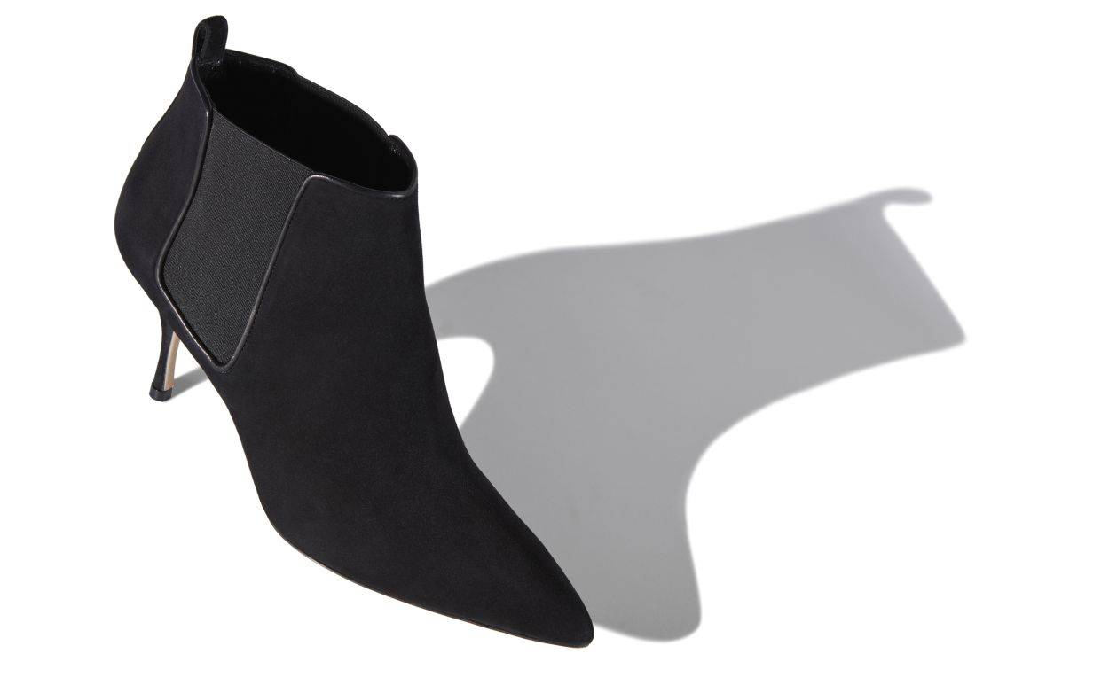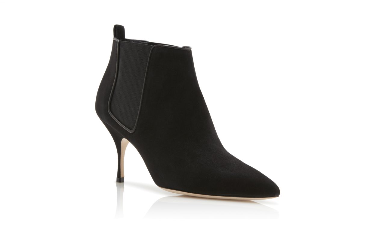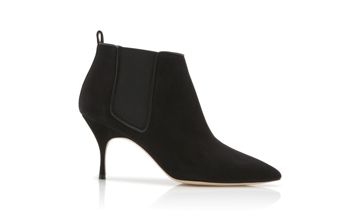 Black suede ankle boots featuring fitted design, elasticated opening and stiletto heel. Upper: 100% calf suede. Sole: 100% cow leather. Lining: 100% goat skin. Heel measures 70 mm. Italian sizing. Made in Italy.
