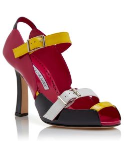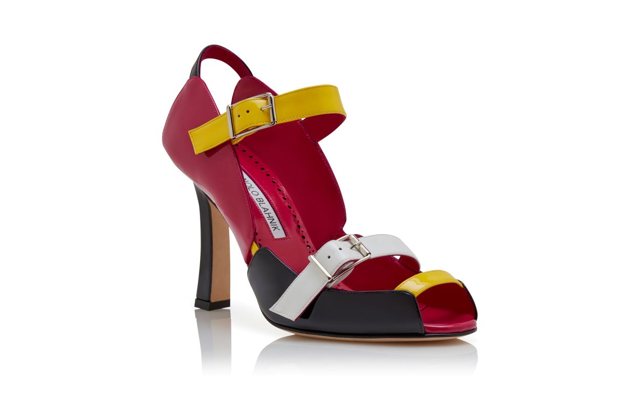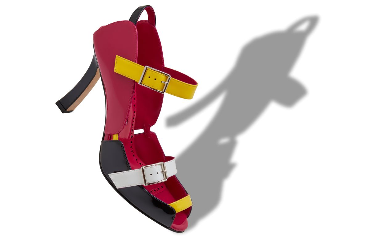 Black and pink patent leather open toe sandals featuring yellow instep strap and white toe strap with decorative buckle closure. Finished with slingback design and flared block high heel.Upper: 100% patent calf. Sole: 100% calf leather. Lining: 100% kid leather. Heel measures 105 mm. Italian sizing. Made in Italy.