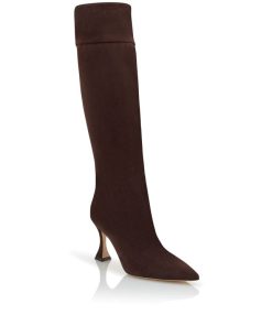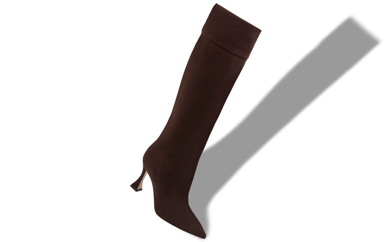 Dark brown suede pointed toe knee high boots featuring slip-on closure and flared high heel.