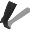 Dark brown suede pointed toe knee high boots featuring slip-on closure and flared high heel.