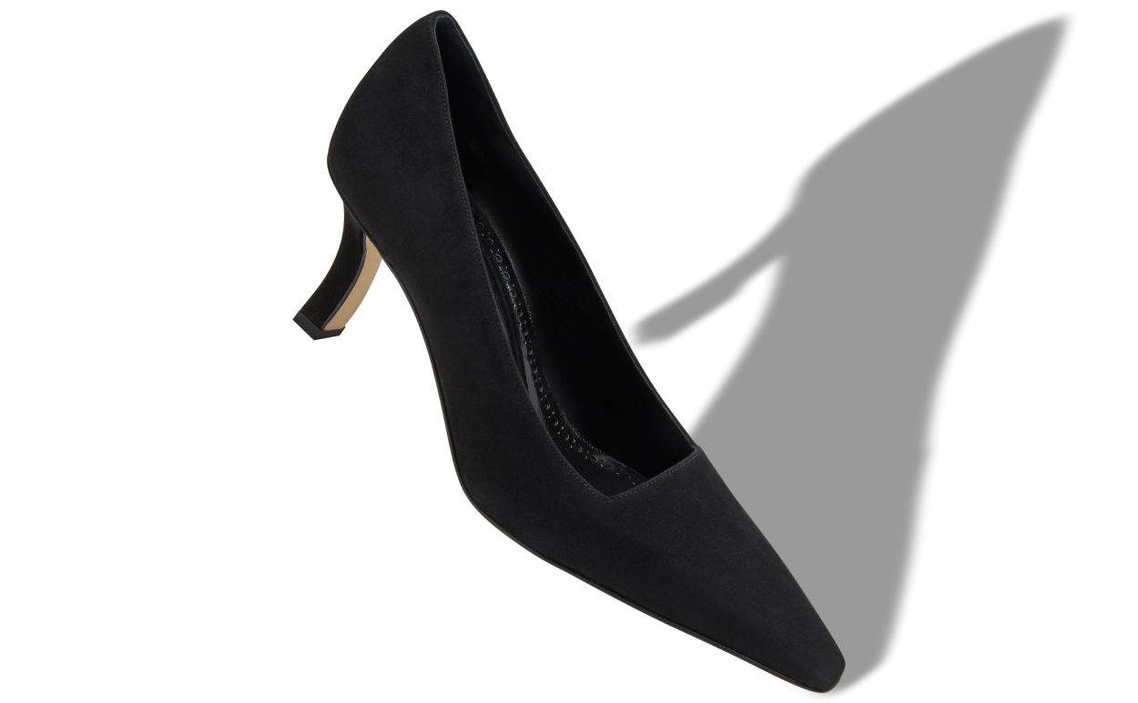 Black suede pointed toe pumps featuring square cut design and flared block mid heel.Upper: 100% kid suede. Sole: 100% calf leather. Lining: 100% kid leather. Heel measures 70 mm. Italian sizing. Made in Italy.