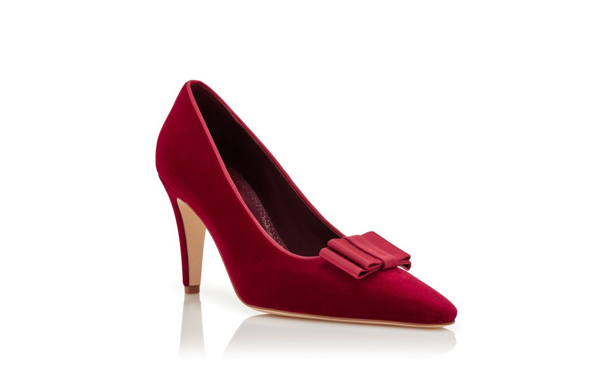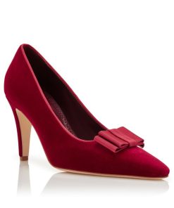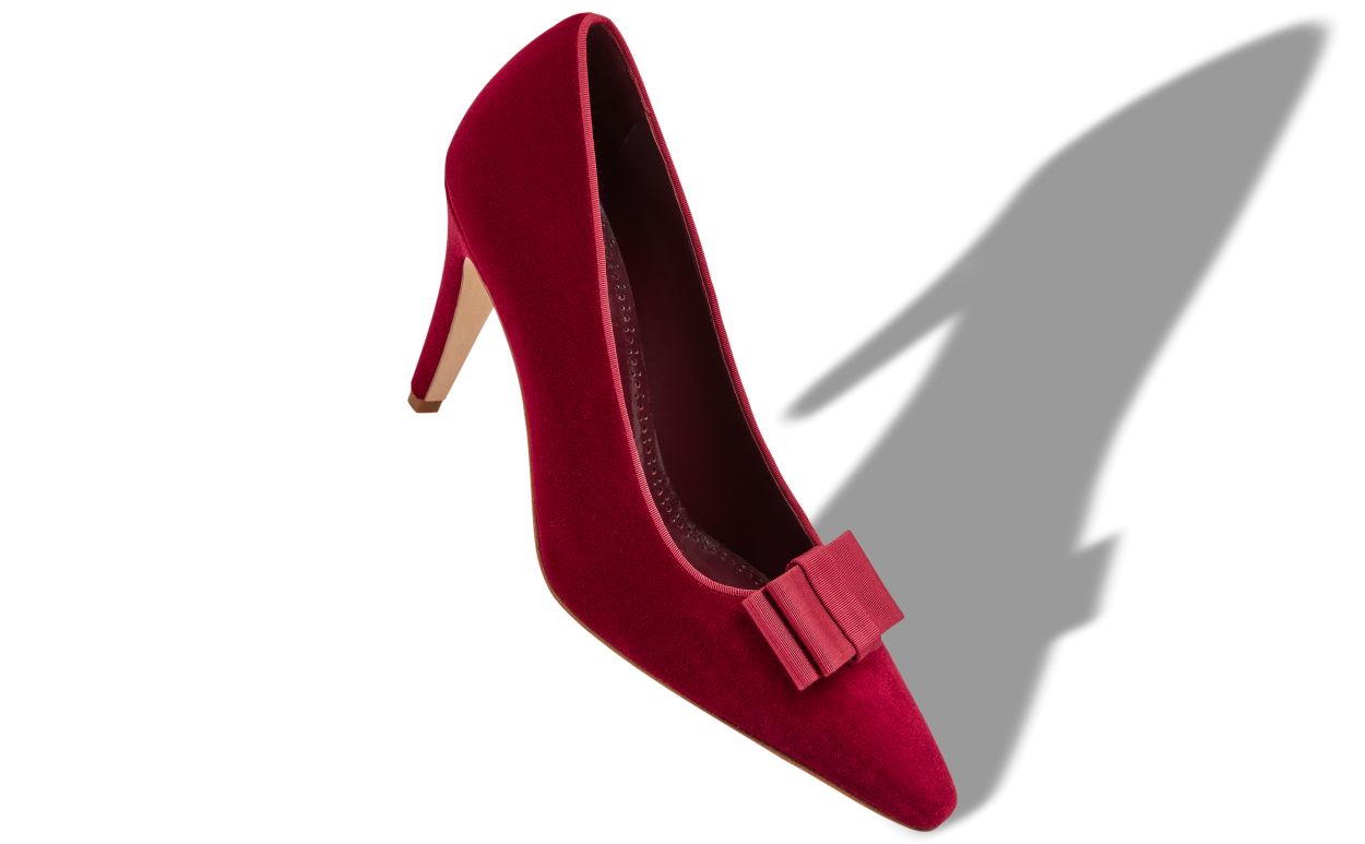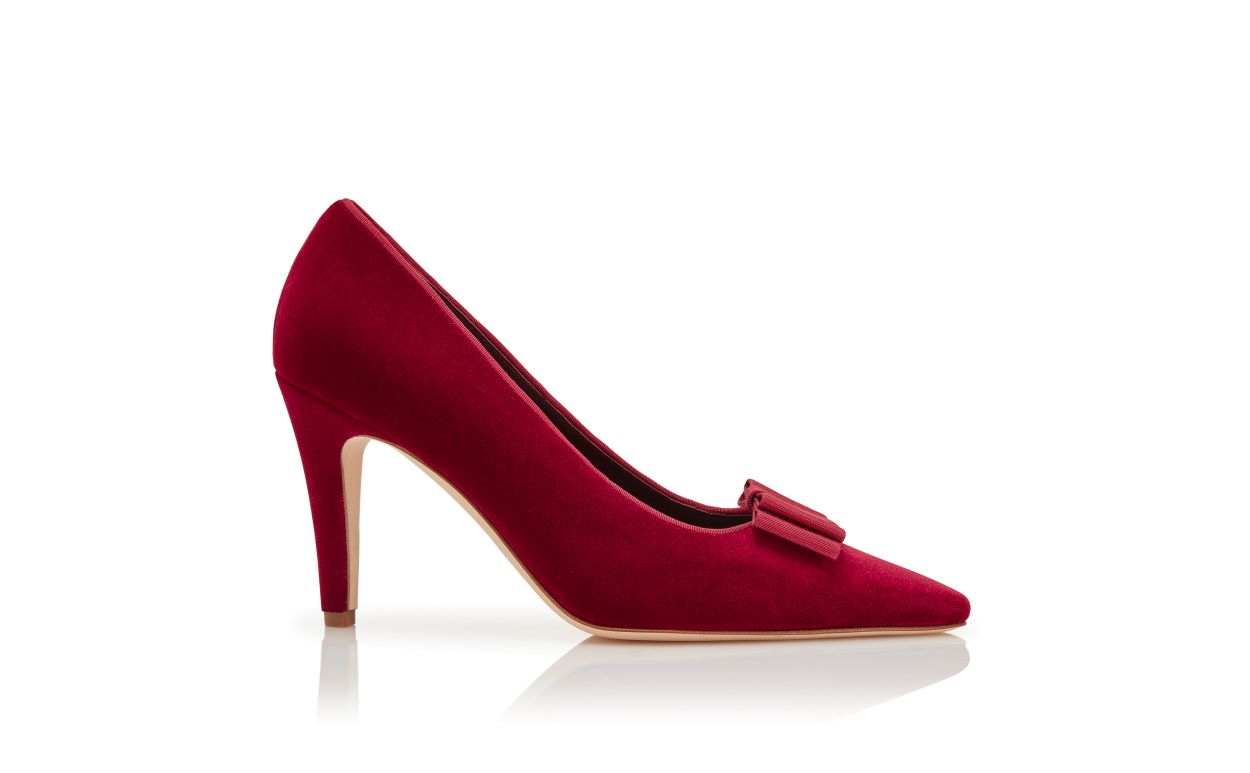 Dark red velvet pointed toe pumps featuring red decorative bow detail, tonal grosgrain trim and stiletto high heel.