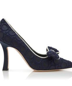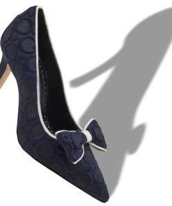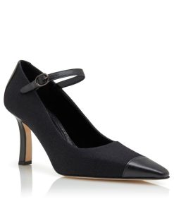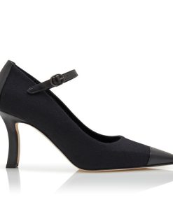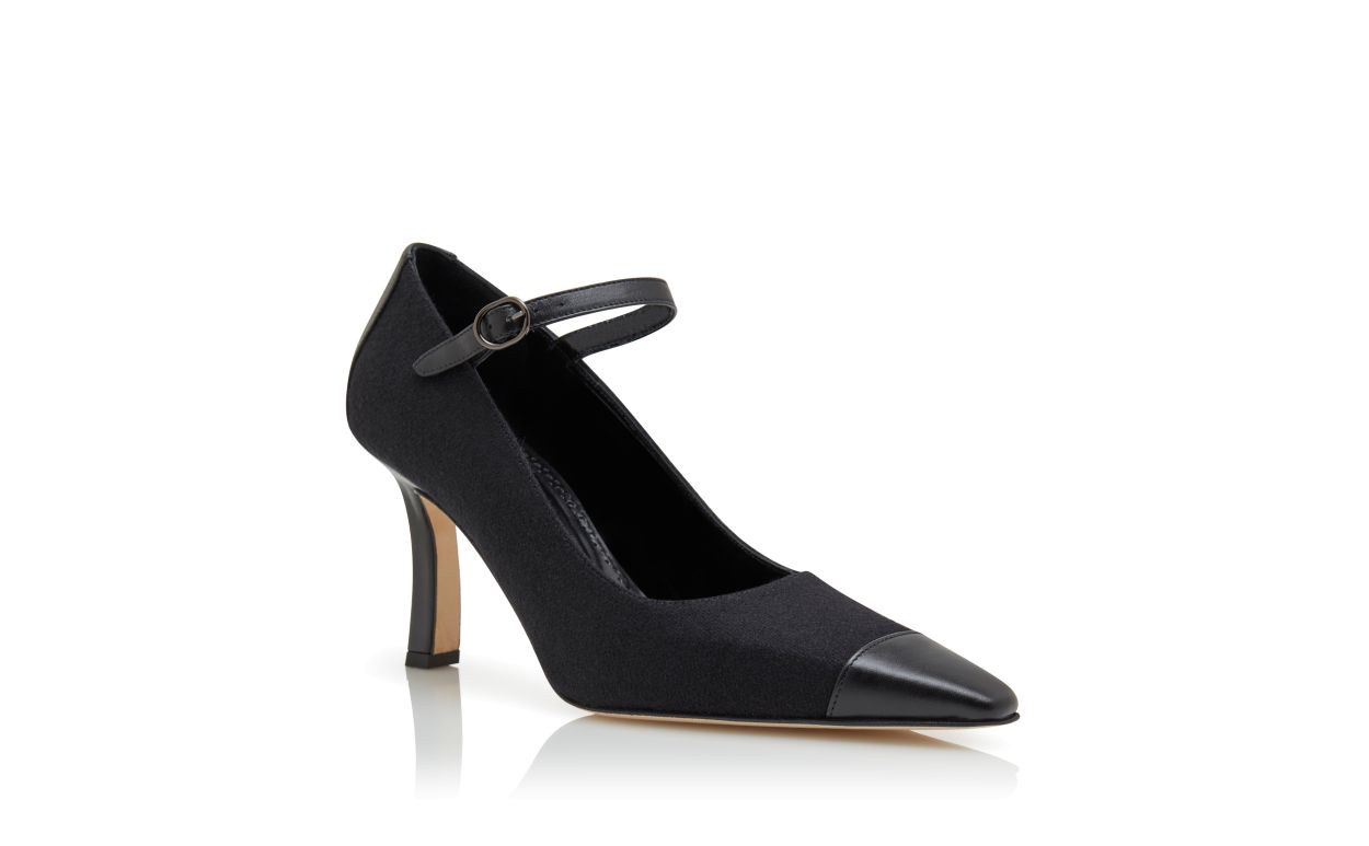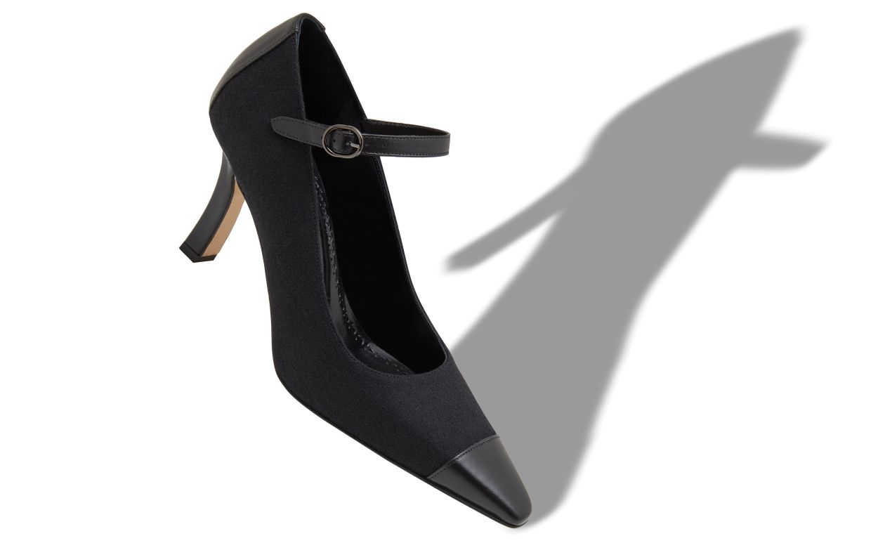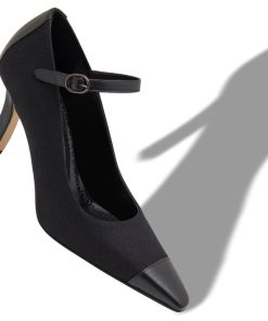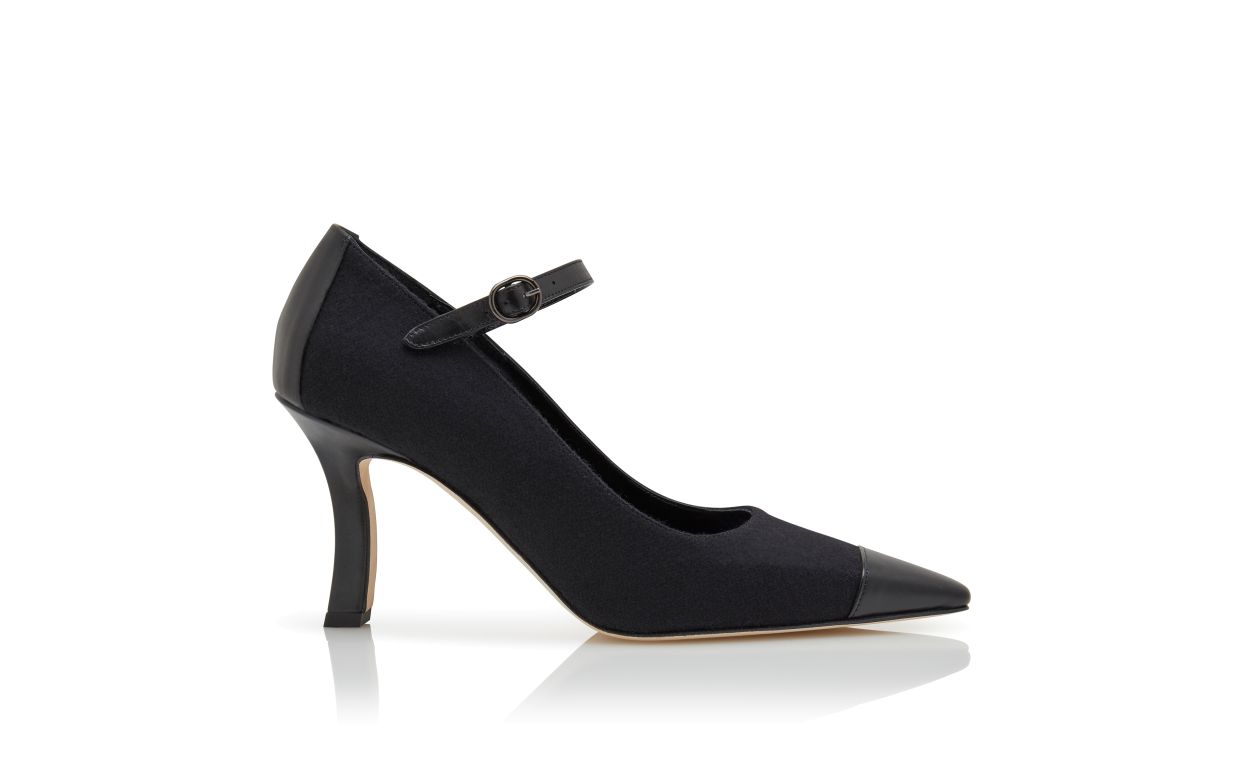 Black wool pointed toe pumps featuring tonal nappa leather counter and toe cap and instep strap with buckle. Finished with angular high heel.