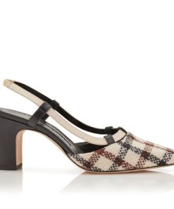 Light beige wool round toe pumps featuring cream calf leather elasticated slingback design, tartan toe cap and block mid heel.